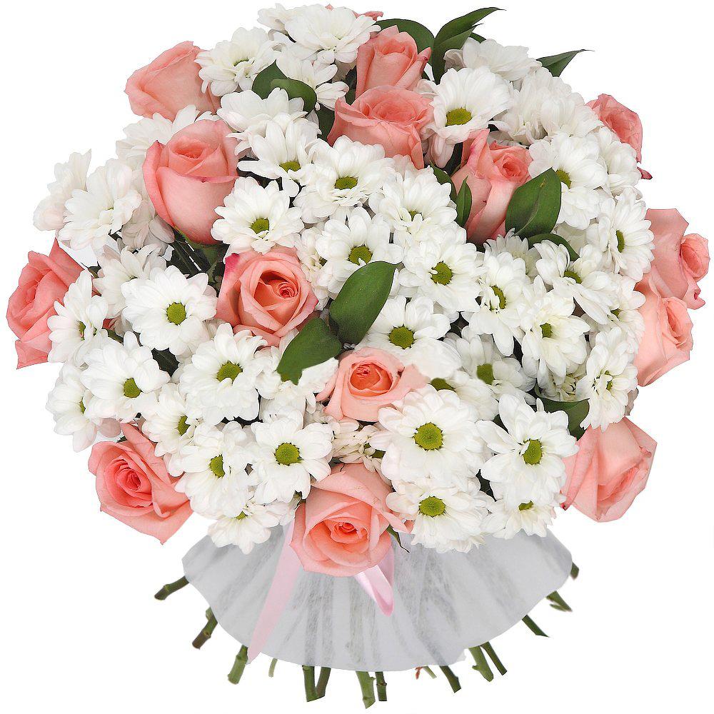 Рускус – 7 шт.Роза розовая – 15 шт.Атласная лента – 1 шт.Фетр белый – 1 шт.Хризантема Кустовая Бакарди белая – 10 шт.